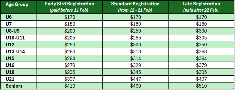 A $50 late fee applies to all registrations from this date.February 2026 - U8 to U16 Grading (if required)